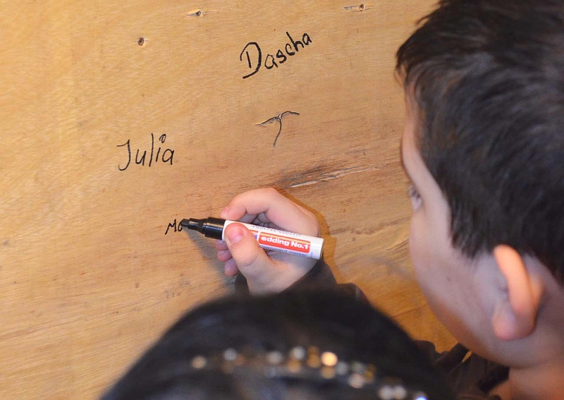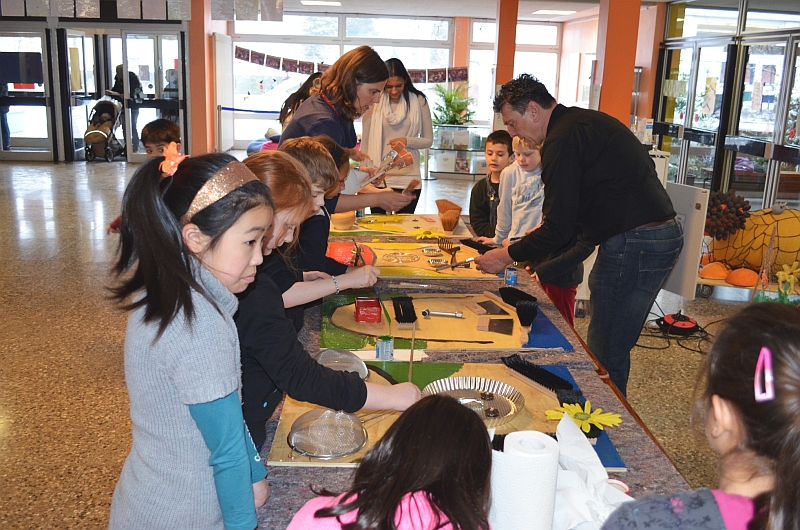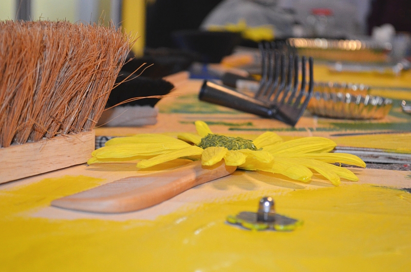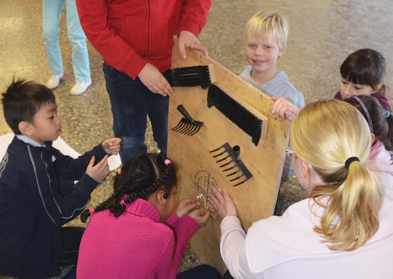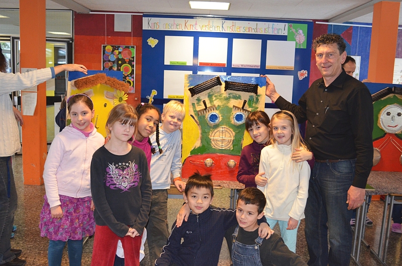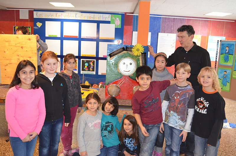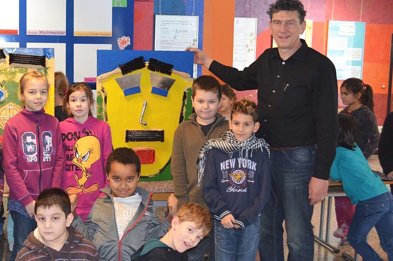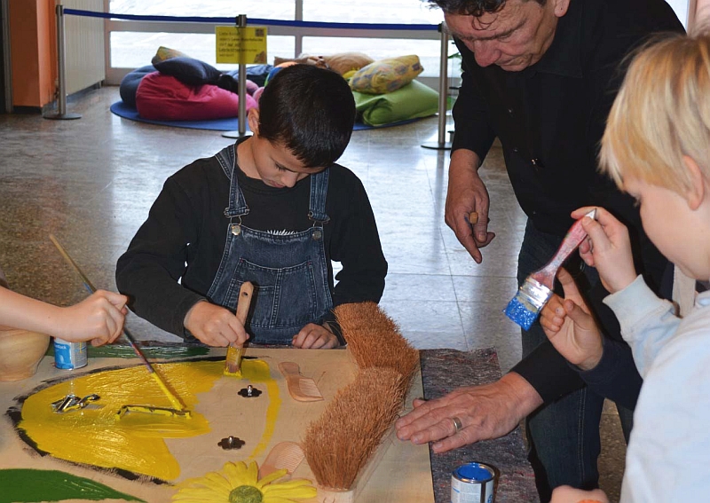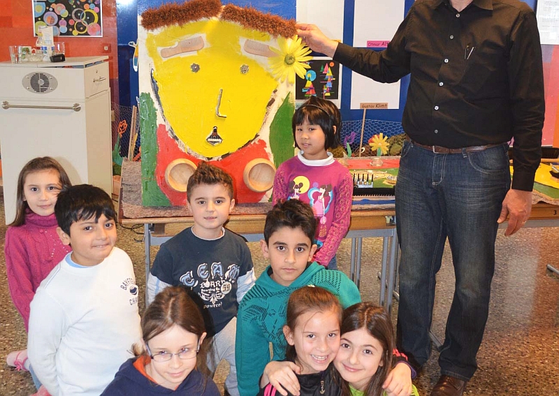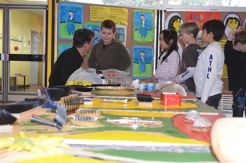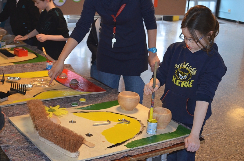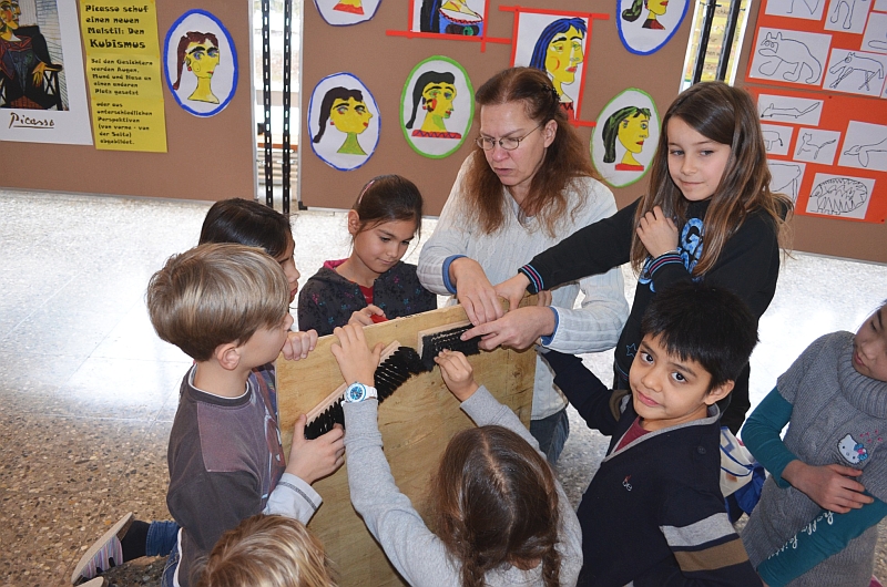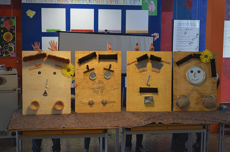 The art of working with objects and seeing them in a new light is something that really appeals to children. It would often be the children viewing my creations that were able to name the component objects without a second thought, sometimes taking mischievous delight in doing so. A haircut made of a brush here, a straw-hat face there. Children's imaginations are really free to run wild once their ability to look at objects in a new way has been awakened. It was precisely this imagination that was the subject of my art morning, which I was invited to host by the Munich-Neuperlach primary school for forty children aged between 9 and 10. In terms of the schedule, I planned for us to work in four groups and create one piece of art per group, so I provided four boards and a wide range of different objects such as brushes, sieves, mortars, raffia flowers and cake tins to produce each piece.